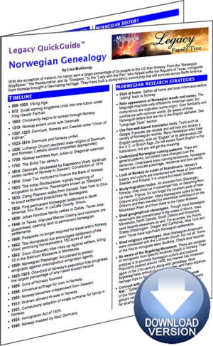 The Norwegian Genealogy Legacy QuickGuide™ contains useful information including a timeline of important events, terminology, migration patterns, record types and how to access those records. This handy 5-page PDF guide can be used on your computer or mobile device for anytime access.